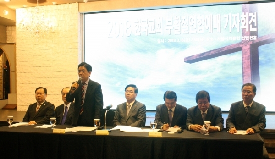 부활절연합예배 설교자, 전명구 목사에서 장종현 목사로 교체▲2018 부활절연합예배 준비위원회 관계자들이 기자회견에 임하고 있다. ⓒ김진영 기자