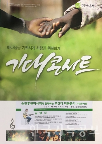 우간다 아동을 위한 나눔콘서트 개최기아대책 순천후원이사회 【순천ㆍ여수】 기아대책 순천후원이사회(회장:공학섭)는 오는 25일 오후 2시 30분 순천의교회(박만희 목사 시무)에서 '우간다 아동 품기' 나눔콘서트를 진행하고, 수익금으로 우간다 아동들의 치료비를 지원한다. 이날 행사는 콘서트에 앞서 우간다 소로티 지역의 자립을 위해 활동해온 기대봉사단 최남오 선교사가 현장의 소식을 전한 후, 김명식 CCM 찬양사역자의 콘서트로 진행된다. 기아대책 후원이사회는 이번 콘서트를 통해 자체적으로 문화콘서트를 열기 어려운 교회들이 연합해 성도들에게 교회생활 활력소를 제공하고, 기아대책과 교회가 지속적인 파트너십을 유지해 아동결연과 해외빈곤퇴치 관련 사업을 전개하고자 한다. 공학섭 회장은 "나눔을 실천하는 일은 그리스도인으로서 당연한 의무로 이번 콘서트를 통해 소외되고 굶주리며 또한 에이즈로 고통받는 우간다 아동들에게 실질적인 도움을 줄뿐 아니라 복음까지 전할 수 있는 출발점이 되길 바란다"고 밝혔다. 한편 1989년 기독교 정신을 바탕으로 설립된 기아대책은 국제선교구호단체로서 국내와 북한을 비롯한 세계 54개국에 기대봉사단을 파견해 국제개발협력 사업 및 긴급구호 사업을 수행하고 있다고 전해졌다. [출처] 한국기독공보 http://www.pckworld.com/news/articleView.html?idxno=76354관리자 I 2018-03-16