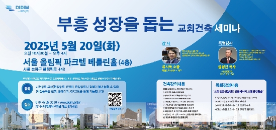 부흥성장을 돕는 교회건축 세미나디딤건축사사무소에서 주관하는 ‘부흥과 성장을 돕는 교회건축 세미나’가 5월 20일(화), 올림픽 파크텔 4층 베를린홀에서 개최됩니다.많은 관심과 참여 바랍니다. 감사합니다. 관리자 I 2025-05-09