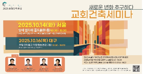 교회건축포럼이 주최하는 미래 지향적인 교회 건축과 운영의 방향을 모색하는 『교회건축세미나 – 새로운 변화 추구하다』가오는 10월, 서울과 대구에서 개최됩니다. 이번 세미나는 다음과 같이 진행됩니다. ▶ 서울 : 2025년 10월 14일(화) 장소 : 양재 엘타워 골드홀 (B1층) ▶ 대구 : 2025년 10월 16일(목) 장소 : 호텔 인터불고 아망떼홀 (본관 2층)