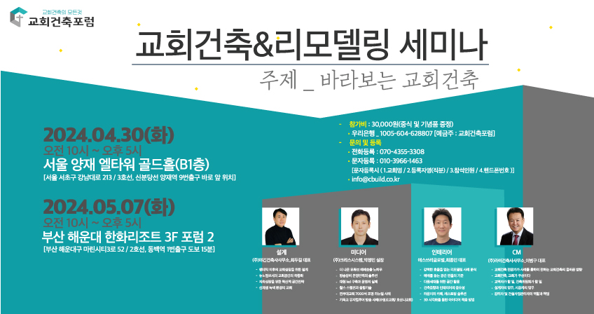 교회건축의 모든것 '교회건축포럼'에서 "교회건축&리모델링 세미나"를 개최합니다.