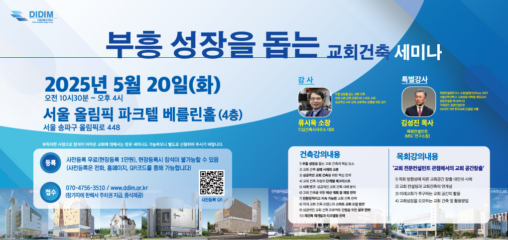 디딤건축사사무소에서 주관하는 ‘부흥과 성장을 돕는 교회건축 세미나’가 5월 20일(화), 올림픽 파크텔 4층 베를린홀에서 개최됩니다.