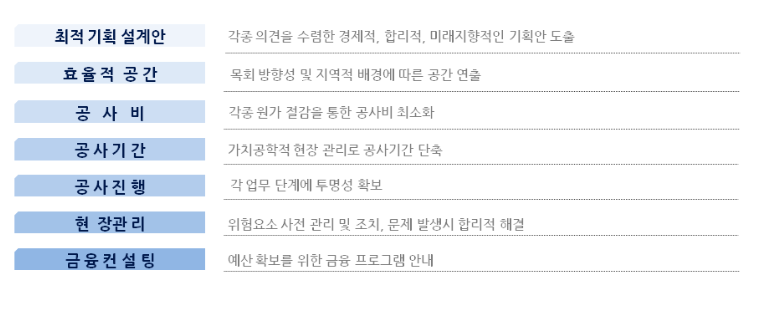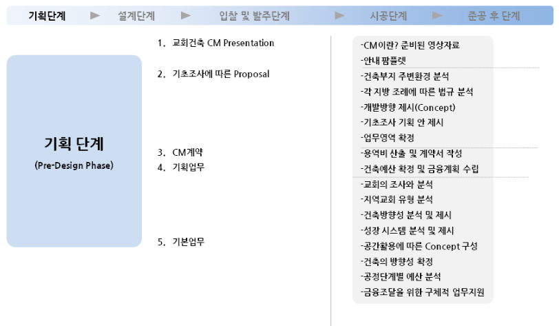 3. <교회건축 CM이란?> 교회를 대신하여 교회건축 전체 진행을 대신하여 주는 것을 말한다. 교회건축의 초기 기획단계에서부터 금융 컨설팅, 설계 공사, 사후관리까지, 전 과정을 ONE-STOP으로 관리하는 신개념 건축관리 기법이다.