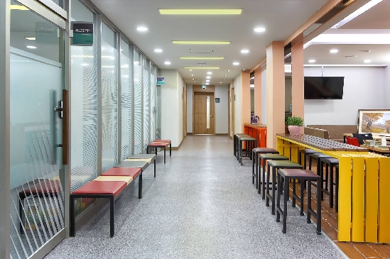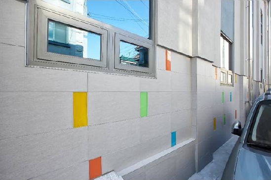 징크 패널의 물성과 겨자색 모듈 창호 등의 동질성으로 통합 작업을 이루었다.